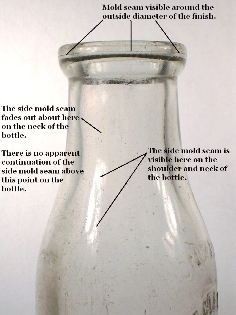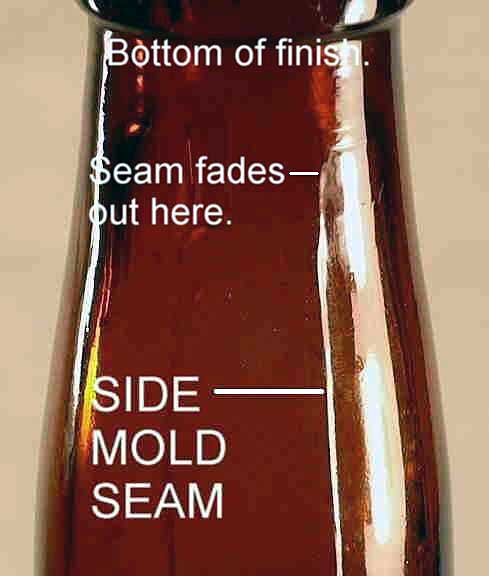 The following is a discussion of the most common exceptions to the side mold seam "rule" describing a few types of machine-made bottles on which the vertical side mold seams do not quite reach the top edge of the finish making them possible appear to be mouth-blown. 1. Fire Polishing - Although infrequently encountered, machine-made bottles may have fire polished finish rims - a process which eradicated evidence of the neck-ring mold seam on the rim of the bottle. These bottles will not have the side mold seam proceeding from the upper finish side over and onto the rim itself. Ostensibly this was done to remove the mold seam rim "bump" that was sometimes left by earlier machines - an action which may have helped facilitate better sealing with crown caps, screw-thread caps, or similar closures which sealed on the rim of the finish. These bottles will, however, have the vertical side mold seam progressing all the way to the very top of the finish side, just not onto the rim. They will also have other machine-made characteristics as described on the Machine-made Bottles page. In the experience of the website author, these machine-made bottles are rarely encountered and likely a function of early machine-made wares (1905 to 1920s) that had less precise mold fitting and resulted in the need for fire polishing to facilitate proper closure function.