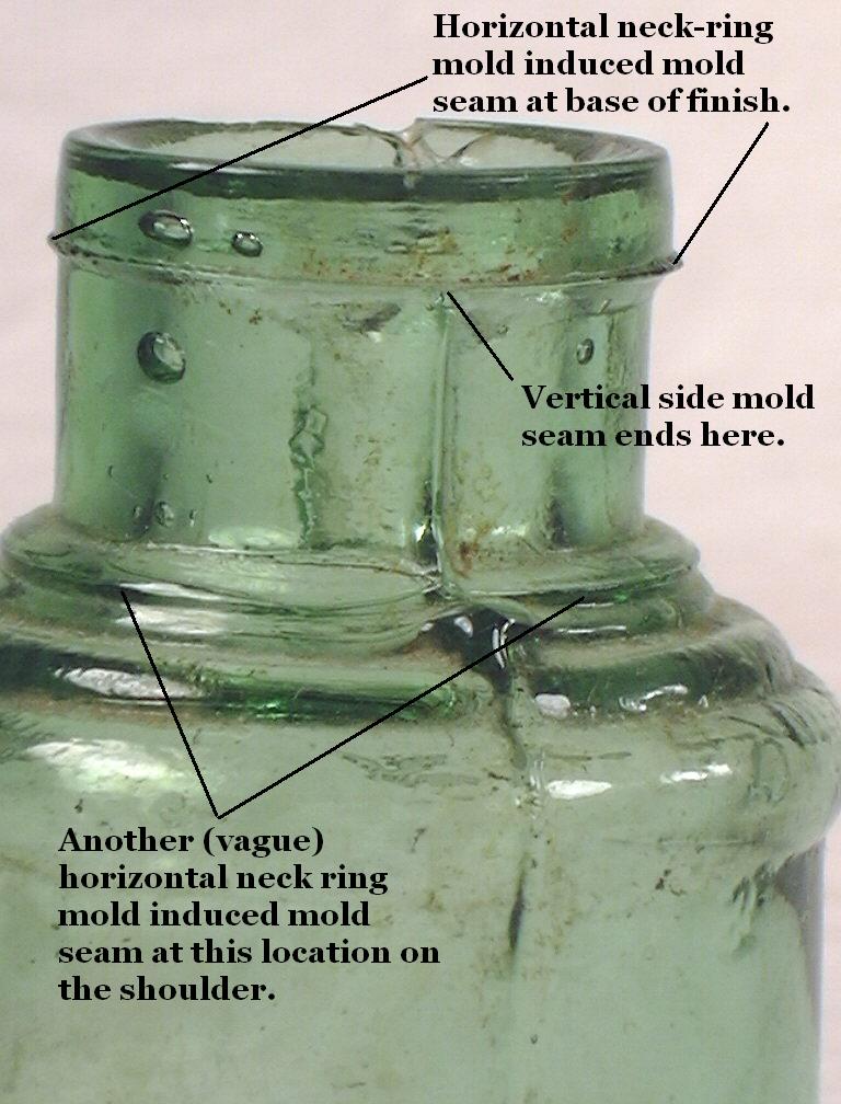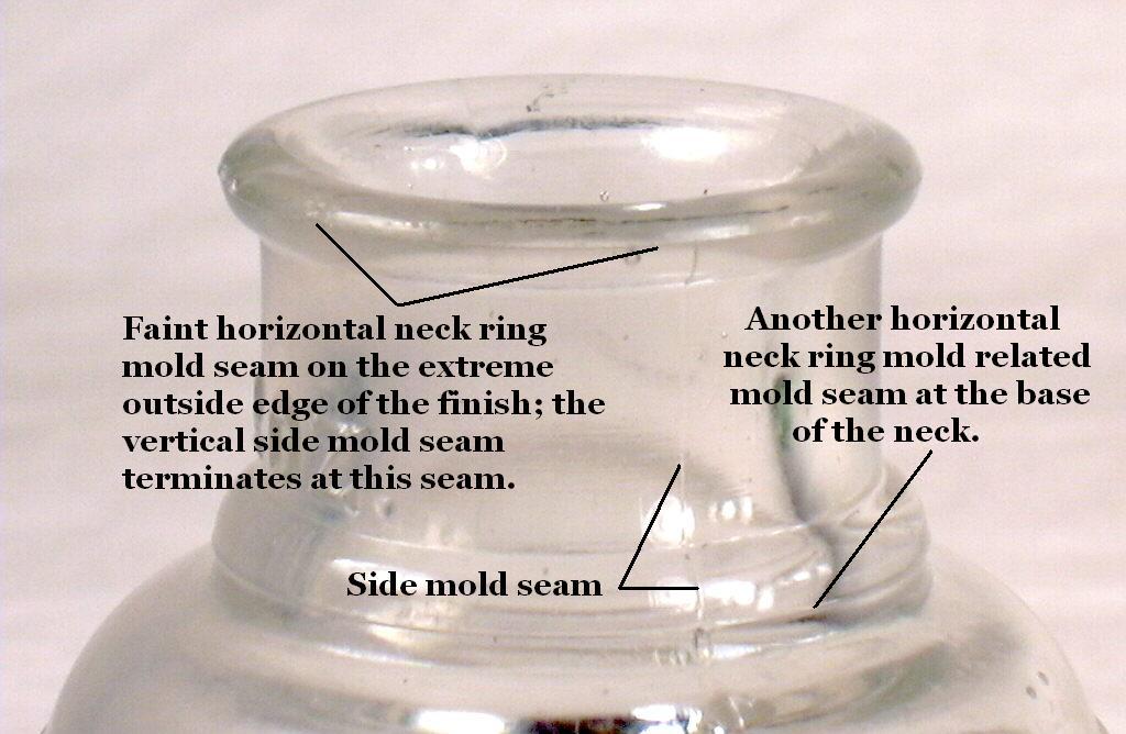 The image to the left is a close-up of the shoulder, neck and finish of a small Sheaffers ink bottle (click to enlarge for more detail). The image shows the vertical side mold seam ending on the outside edge of the bead finish at a "ring" mold (the upper portion of a parison or "blank" mold) induced horizontal mold seam that encircles the extreme outer edge of the finish. The side mold seam does not extend onto the top surface of the finish, i.e., does not cross the rim and in fact, does not extend the full length of the outside edge of the bead finish. These features are pointed out - and much more readable - on the larger hyperlinked image; click to view.