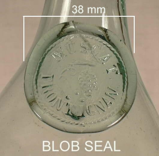 2. If the embossing on a bottle is only within a separately applied blob seal similar to that shown to the right (click to enlarge), and found nowhere else on the bottle, the bottle is almost certainly mouth-blown. Click QUESTION #4 to pursue more information on the Mouth-Blown Bottles portion of this key (you will move to another webpage). This is another low probability choice but certainly possible.