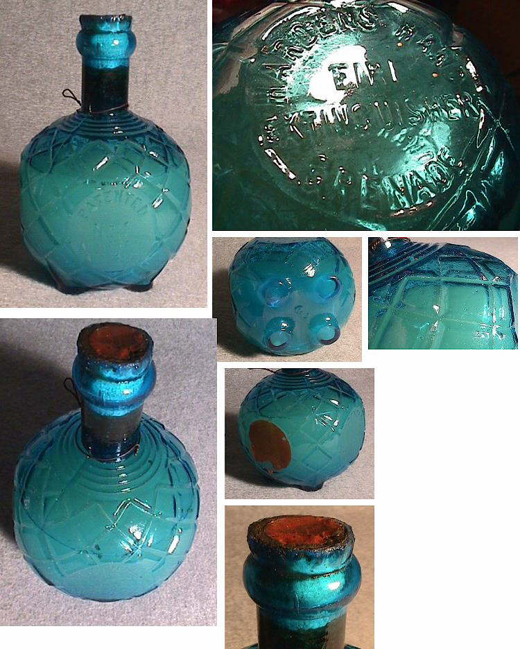 This termination of the side mold seam within the finish short of the rim (Sheaffers ink) or actually short of the finish itself (green ink) on these bottles makes it appear upon casual glance that these are mouth-blown bottles having either an improved tooled finish (Sheaffers) or an applied finish (green ink). However, both bottles are certainly machine-made. (Click Sheaffers Ink to view the discussion of this bottles features on the Household Bottles typology page.) The Sheaffers ink was made on the blow-and-blow Owens Automatic Bottle Machine as indicated by the a base makers marking for the Owens-Illinois Glass Co., along with a distinct suction scar, and a date code for 1940 which is well after the end of mouth-blown production of utilitarian bottles. There is also no neck ring mold seam immediately below the finish like found on most Owens machine produced bottles and on a majority of all machine-made bottles. Instead, there is one located near the base of the neck indicating that the neck ring mold portion of the parison mold produced the finish, neck, and a portion of the shoulder. (This is also pointed out on the image above; click to enlarge.) The earlier green glass ink bottle is also certainly machine-made, most likely on an early semi-automatic, press-and-blow machine based on its crudeness and lack of a suction scar. (A likely machine used for making this ink bottle was the "Blue Machine." See the following linked article for more information: http://www.sha.org/bottle/pdffiles/TheBlueMachine.pdf ) It also has no neck ring mold seam immediately below the finish like found on most Owens machine produced bottles (or on the majority of machine-made bottles). Instead, there is distinct horizontal mold seam protruding slightly on the outside edge of the lower finish and another vague mold seam encircling the bottle located on the shoulder near the base of the neck. This indicates that the neck ring mold portion of the parison mold produced the finish, neck, and a small portion of the shoulder. (These are all pointed out on the image above; click to enlarge.) Both these described machine-made ink bottles exhibit no sign of the concentric, horizontal finishing 0r lipping tool induced marks that would be present on a mouth-blown finish which was hand tooled to shape. (These bottles are discussed in more detail in the ink bottle section of the Household Bottles (non-food related) typology page.) If your bottle is an ink fitting the descriptions above, click Machine-made Bottles to move to the Machine-made bottles dating page for more possible dating refinement and to pursue more information. |