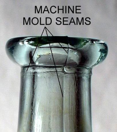 seams on mouth-blown and most machine-made bottles - in good light with a hand lens to see if there is