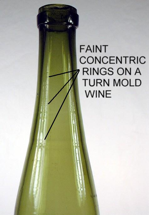 Note: All turn/paste mold, free-blown, and dip molded bottles are also mouth-blown or hand made bottles, which is covered more on the Mouth-blown bottle dating page (link below).