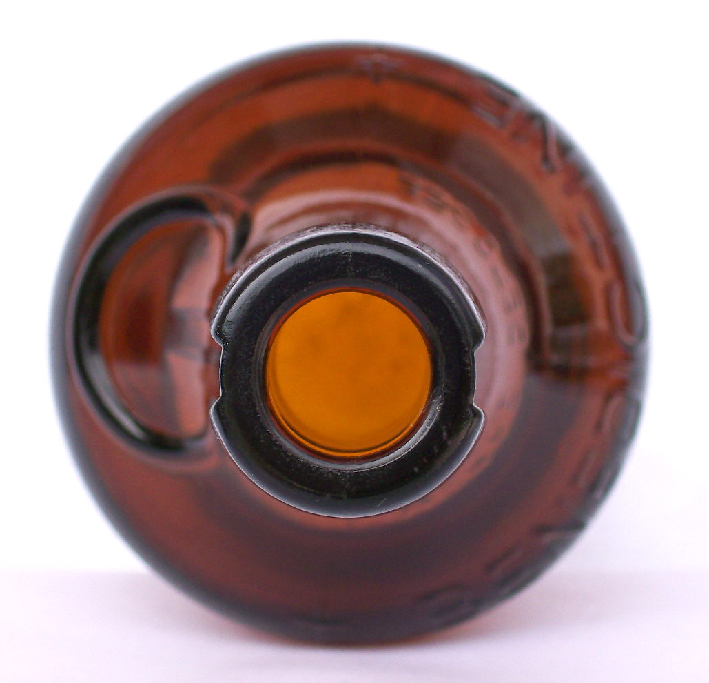 ![]() The finishes on Baltimore Oval flasks are typically a tooled or "improved" tooled brandy or straight brandy type, though mouth-blown versions do frequently come with external screw-threads like the flask pictured below. Some larger versions of this style bottle were made with inside screw threads - see the "Rectangular Spirits Bottles" portion in the "Square/Rectangular" spirits bottle section above. These flasks also always seem to have air venting marks - often many in various places - and were blown in a cup-bottom mold; all features consistent with an early 20th century manufacture. The pair of amber flasks pictured above are pint and half-pint (true sizes) Baltimore Ovals which are embossed in a plate with GULLEY'S FAMILY LIQUOR STORE / 304-1ST STREET. / PORTLAND, ORE. Just what a "family liquor store" meant may seem strange to us these days (drinking children?), though it was likely a reference to a liquor store owned by the James J. Gulley family. It was not an uncommon designation during the early 20th century and likely was an attempt to put a more humane face on liquor sales during those volatile days of rising prohibitionist fervor. (In fact, if you run a search on the internet now one will turn up a lot of "family liquor stores" still in existence. As a side note, some liquor merchants actually bottled their products in bottles strongly identified with prescription druggist bottles. Click the following link to see a "Blake" style druggist bottle unabashedly use by a Washington, D.C. liquor seller - WM. D. Barry Reliable Family Liquor Store.) All of these GULLEY'S flasks have improved tooled finishes, multiple air venting marks on both shoulders and along the mould seams, and were blown in a cup-bottom mold; all consistent with the business dates for James Gully from 1908 to 1911 (Thomas 1998a). Click on the following links to view more images of the pint size: base view; side view; close-up of the shoulder, neck, and finish.