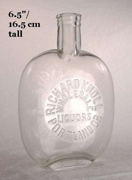 ![]() Distinguishing features of the Eagle flask style are: the precisely vertical/parallel sides, the short base pedestal which is almost as wide as the body, the highly compressed body from front to back giving a cross section that is a very flattened oval, and the bead ring on the neck typically right above the junction of the neck and shoulder (like the pictured flasks). These flasks came in a myriad of sizes from 3 ozs. to 32 ozs., though the most popular were the pint and half pint sizes judging from the examples seen today (IGCo. 1906, 1920; Obear-Nester 1922). The finish on these flasks is almost always a brandy/straight brandy style with the bead ring collar about the same size and diameter as the lower neck ring. Rarely, the finish is an oil finish; other finish styles are, of course, possible but have not been observed (empirical observations). The Eagle flasks pictured here are embossed with SPRING VALLEY / WINE CO. / "THE BIG STORE" / 2ND & YAMHILL / PORTLAND, ORE. in a round plate, and FULL POINT and FULL 1/2 PINT on the lower front (picture below right). This company began operation in 1909 and ended business by the end of 1915 when statewide Prohibition in Oregon was passed and took effect (Thomas 1998a). These flasks have "improved" tooled finishes, multiple (5) air venting marks on both shoulders, and were blown in a cup-bottom mold - all consistent with a late mouth-blown production date (1900 to mid 1910s). These are typical shape and sizes of the Eagle flask. Click on the following hyperlinks to view more pictures of the pint flask: base view; side view; close-up of shoulder, neck, and finish.