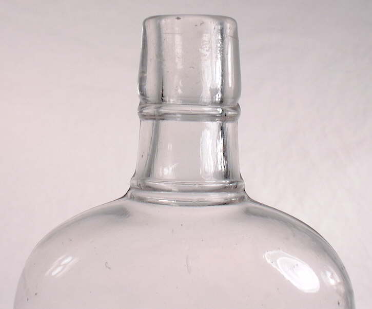 The color of picnic flasks is dominated by clear or colorless (sometimes with a pinkish, amethyst, or faint straw tint); aqua and shades of amber are much less common; any other color is very unusual. Click picnic colors to view an image of the array of different glass colors that are possible in this style of flask. This photo also shows the finish variety that can be found, which is relatively limited. (Image courtesy of Garth Ziegenhagen.) The typical picnic finish is the double ring, though the brandy, straight brandy, bead, oil, and even internal and external screw threads were utilized on occasion. Click pint picnic flask with continuous external screw threads to see a ca. 1900-1910 mouth-blown example with the cap in place (it has a ground finish rim). Click screw thread close-up to see a close-up which shows that the glass under the cap does not have the slight pinkish tint that the remainder of the bottle exhibits, which has been exposed to daylight. (See the Bottle/Glass Colors page for more information on sun colored amethyst bottles.) Like the shoo-fly flasks, picnic flasks were primarily used for various spirits though they have been noted with labels/embossing for other products including Jamaica ginger (high alcohol medicine - click C. H. Eddy & Co. / Jamaica Ginger / Brattleboro, VT. to view a picture of a picnic shaped, embossed Jamaica ginger), various medicinal products, tea and flavoring extracts, and occasional other non-carbonated liquids like bicycle lubricating oil (Thomas 1974).